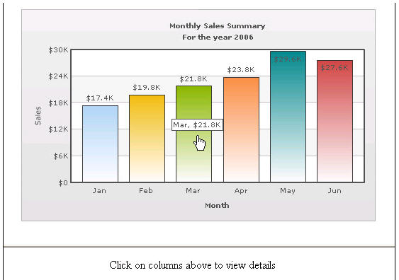 Linking to Frames The chart view allows you to open links in specified frames too. To do so, you just specify the name of the frame in the link itself. To open link in a specified frame 1 From Chart Attributes, click Edit. 2 Click Functional. 3 In the Click URL field, set the link as in the following example: link='F-FrameName-ShowDetails.asp%3FMonth%3DJan' Where: • F denotes the link opens in a frame • -FrameName denotes the name of the frame to be opened • -ShowDetails.asp%3FMonth%3DJan denotes the actual link to be opened. The link needs to be URL Encoded. In this example, the main frameset is contained in FrameExample.html, which has two vertical frame pane- one on top containing the chart (FramePages\FrameChart.html) and one on bottom to show the linked frame pages. The bottom pane by default shows FramePages\LowerFrame.html which contains the message "Click on columns above to view details". The setup looks like the following: Figure 17. Linking to Frames