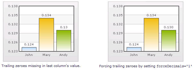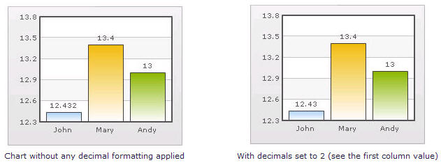 Controlling Decimal Precision All the charts types in qChartView support the attribute decimals. This single attribute lets you control the decimal precision of all the numbers on the chart. Using this attribute, you can globally set the number of decimal places of ALL numbers of the chart. To globally set the number of decimal places 1 From Chart Attributes, click Edit. 2 Click Number Formatting. 3 Enter a value in the Decimal box. 4 Click Save. For example, if you have numbers on your chart as 12.432, 13.4 and 13 and you set Decimals='2' , the numbers would be converted to 12.43, 13.4 and 13 respectively. Figure 18. Controlling decimal precision Similarly, if you had data as 0.12342, 0.134 and 0.13, and you set Decimals as 3, qChartView would output 0.124, 0.134 and 0.13 respectively. Even though the Decimals is set to 3, qChartView does not add the 0 padding to 0.13 to form 0.130. However, if you want your numbers on the chart to have trailing zeroes too, you can set Force Decimals=true and now the numbers would show as 0.124, 0.134 and 0.130 respectively, as shown in these examples: Figure 19. Force decimals