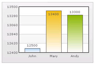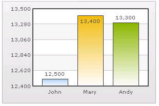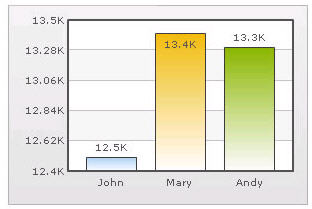 Automatic Number Formatting qChartView automatically formats your numbers by adding K,M (Kilo, Million) and proper commas to the numbers, as shown in this example: Figure 20. Automatic Number Formatting The data for chart is 12500, 13400 and 13300. qChartView automatically formats the number scaling to convert to K (Thousands) & M (Millions). If you do not want to truncate numbers 1 From Chart Attributes, click Edit. 2 Click Number Formatting. 3 From Format Number Scale, select False. 4 Click Save. When you now view the chart, you will see the following: Figure 21. Not truncating numbers In the example above, qChartView is showing full numbers on the chart. It has also added commas to the numbers at the required places. If you do not want to set commas 1 From Chart Attributes, click Edit. 2 Click Number Formatting. 3 From Format Number, select False. 4 From Format Number Scale, select False. 5 Click Save. Figure 22. Not setting commas The commas have been removed from numbers.