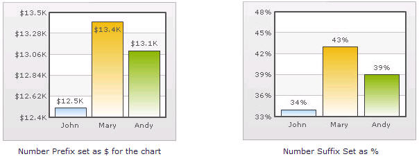 Adding Number Prefix and Suffix qChartView allows you to add a prefix or suffix to all numbers on the chart. To add a number prefix or suffix 1 From Chart Attributes, click Edit. 2 Click Number Formatting. 3 In the Number Prefix box, enter a character or value. For example, to represent dollar figures, enter $. 4 In the Number Suffix box, enter a character or value. For example, to represent figures quantified per annum, enter p.a. 5 Click Save. If you intend to use special characters for Number Prefix or Number Suffix, URL Encode them when using dataXML method. For example, if you wish to have numberSuffix as % (for example, 30%): numberSuffix='%25' In dataURL method, you can directly specify the character. Figure 24. Adding number prefixes and suffixes