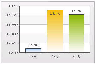 Setting Number Scaling Number scaling lets you define your own scales for numbers and then apply it to all numbers on the chart. For example, if your numbers on the chart are greater than 1000, qChartView scales them to K (Thousands) or M (Millions). For example, if you plot a chart with data as 12500, 13400 and 13300, you will see the following chart: Figure 26. Setting number scaling qChartView has scaled the numbers down to K. By default, qChartView has the K,M (1000,1000) scaling defined for each chart. You can, however, customize it. You can perform the following procedures: • Adding Billions to Default Scaling • Putting Time in Scale