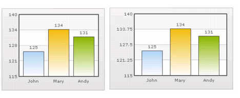 Formatting Y-axis Values Decimal in Manual Div-Lines Mode If you want to set the number of divisional lines on chart, you can control the decimals of y-axis values separately. For example, consider the following attributes and chart: Y Axis Min Value='115' Y Axis Max Value='140' Zero Plane=false Number of Division Lines='3' > Figure 25. Formatting y-axis In this chart, the chart lower limit, upper limit, and number of divisional lines have been manually set. qSIChartView will not automatically adjust divisional lines. In the chart, qSIChartView has truncated decimals from y-axis values, as it cannot find any other decimal values on the chart. You can, however, show decimals on y-axis values in this case (when Zero Plane is false) using Y Axis Value Decimals attribute, for example Y Axis Min Value='115' Y Axis Max Value='140' Zero Plane=false Number of Division Lines='3' Y Axis Value Decimals='2' Decimals='0' >. When you now see the chart, 2 decimal places on y-axis values appear. But, the other numbers on chart would still have 0 decimal places. NOTE: Force Decimals does not work in this mode.